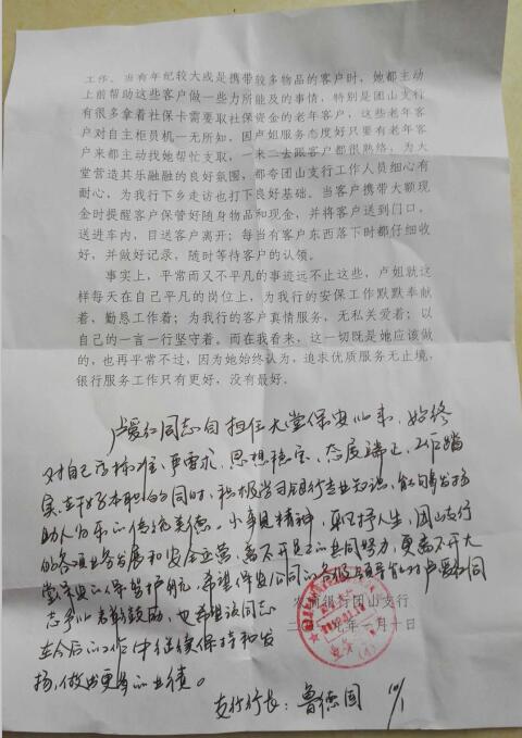 在客流量較多時地能主動鋪助大堂經(jīng)理完成客戶的分流和引導(dǎo)工作,當(dāng)有年紀較大或是攜帶較多物品的客戶時,她都主動上前幫助這些客戶做一些力所能及的事情,特別是團山有很多拿著社??ㄐ枰∩绫YY金的老年客戶,這些老年客戶對自主柜員機一無所知,因盧姐服務(wù)態(tài)度好只要有老年客戶來都主動找她幫忙支取,一米二去跟吝戶都很熟絡(luò),為大堂營造其樂融融的良好氛圍,都夸團山支行工作人員細心有耐心,為我行下鄉(xiāng)走訪也打下良好基礎(chǔ)。當(dāng)客戶攜帶大額現(xiàn)金時提醒客戶保管好隨身物品和現(xiàn)金、并將客戶送到門口送進車內(nèi),日送客戶離開;每當(dāng)有客戶東西落下時都仔細收好,并做好記錄,隨時等待客戶的認領(lǐng)